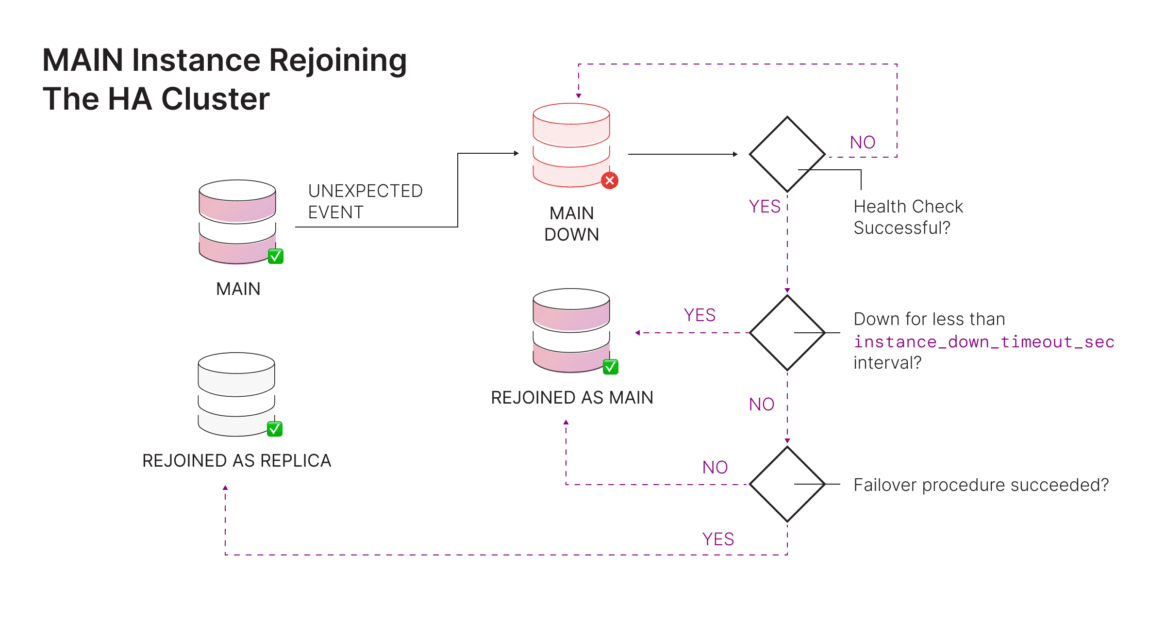 When the MAIN instance restarts, it is initially prevented from accepting write operations. Writes become allowed only after the coordinator confirms the instance’s state and sends an