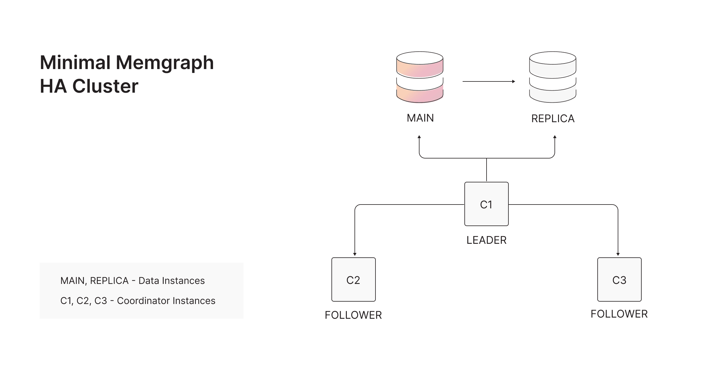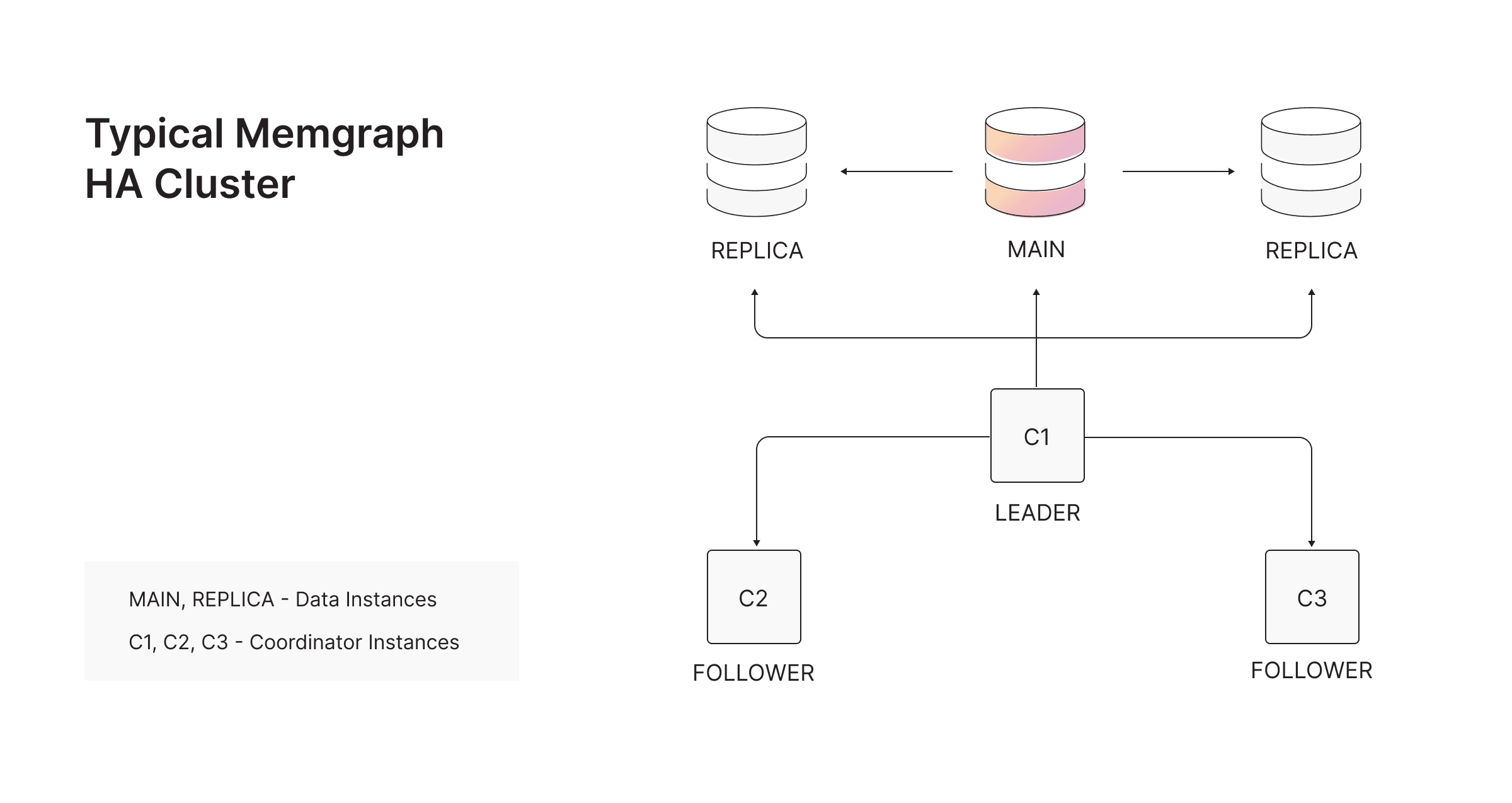 High availability (HA) in Memgraph ensures that the cluster can always serve queries, even when nodes fail. It is built on two foundations: