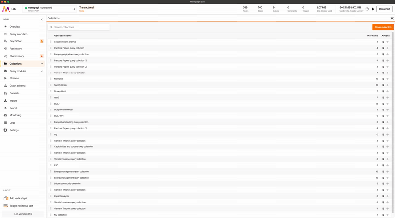 Memgraph Lab’s Layout feature allows you to split the work area horizontally into two sections or vertically into up to five sections, enabling you to work across multiple views simultaneously.
