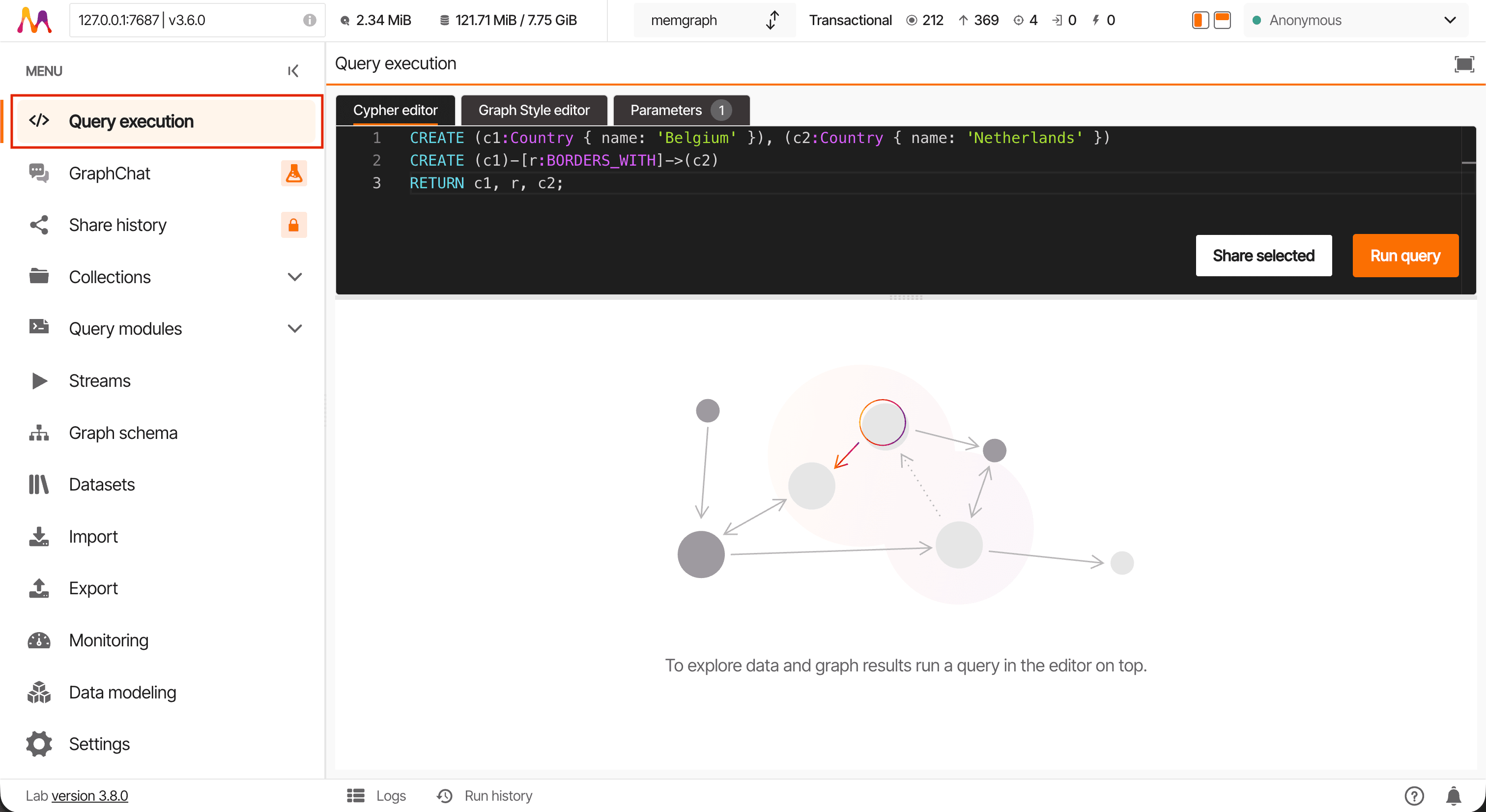 The Query execution section is the primary interface for working with Cypher in Memgraph Lab. It includes: