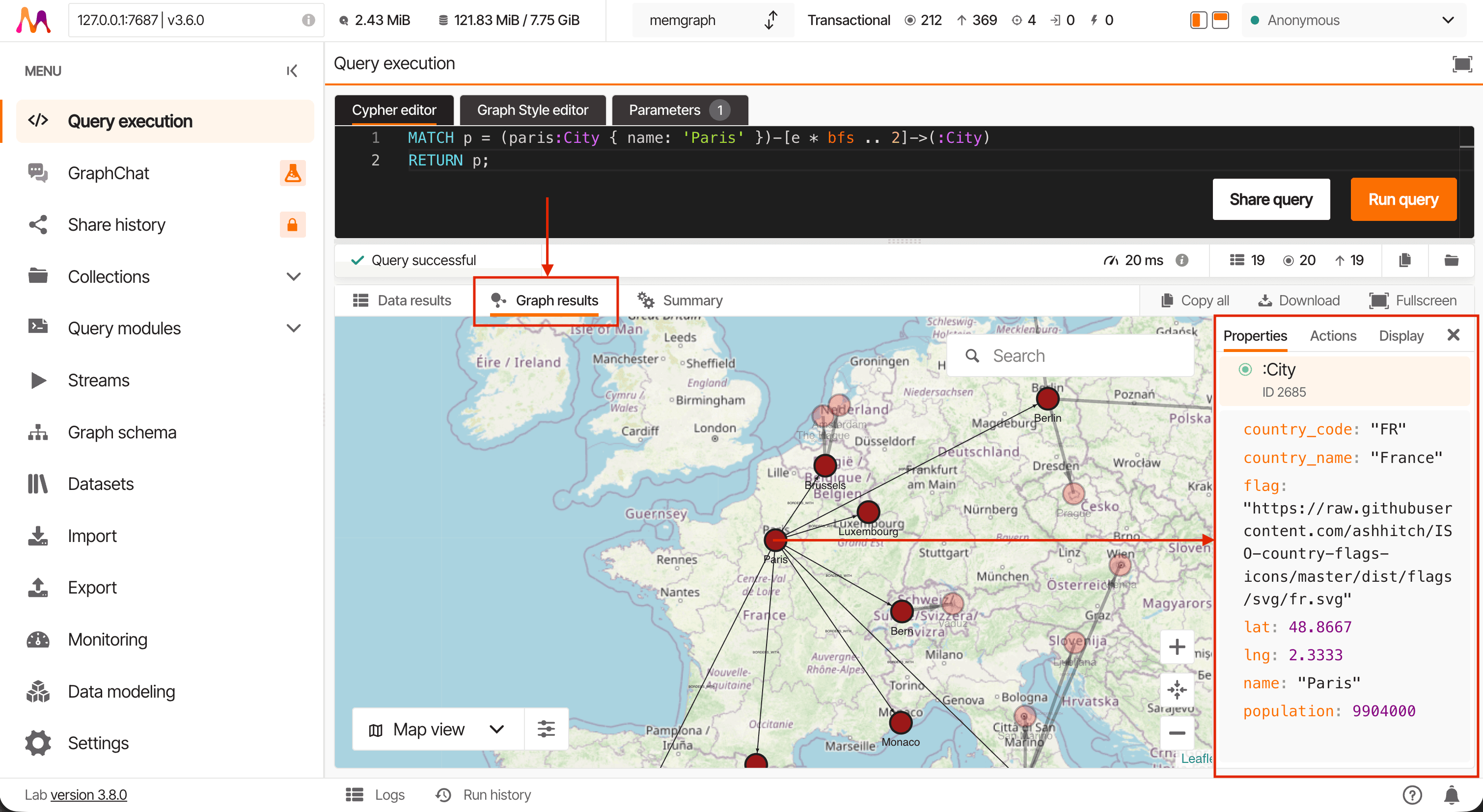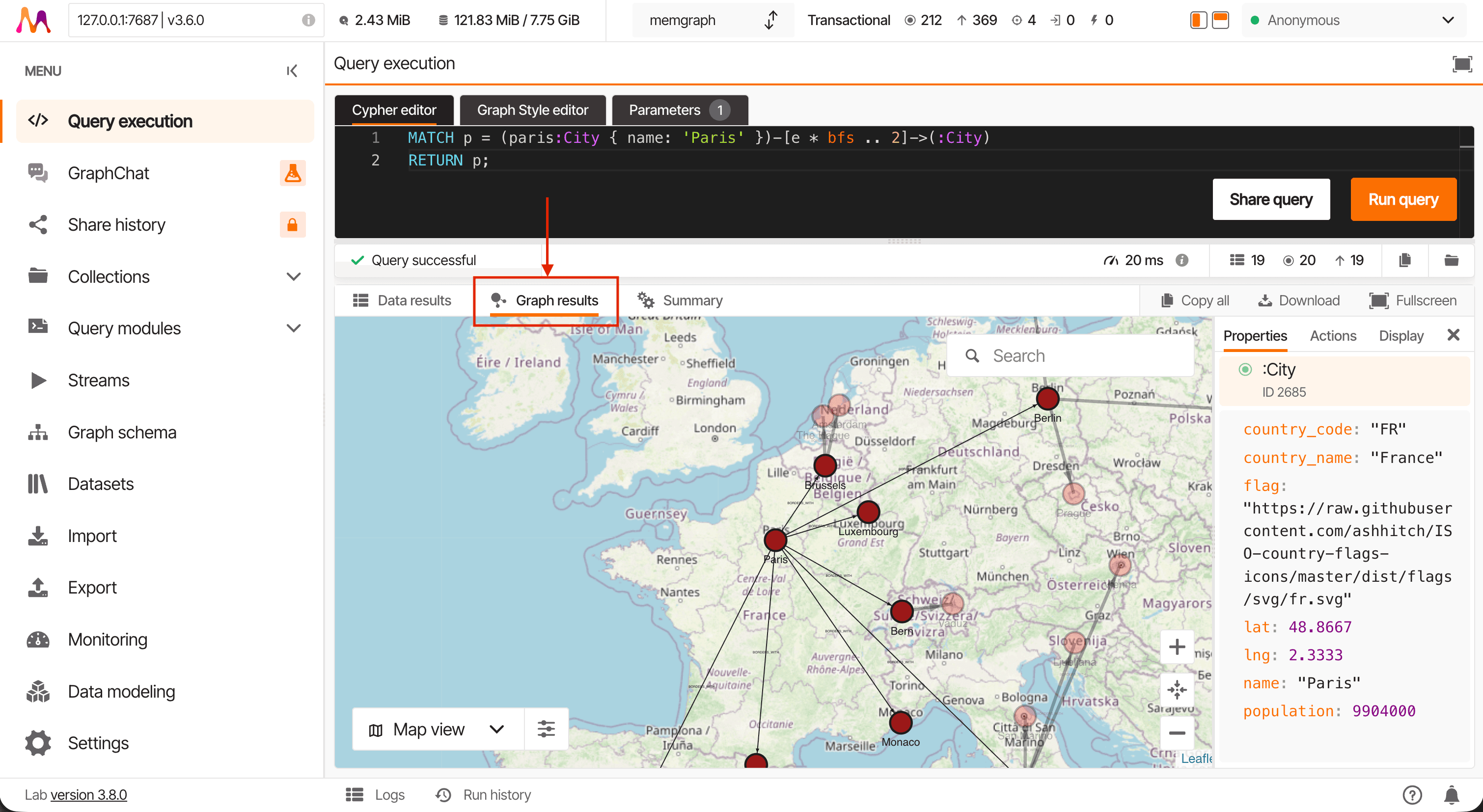- View query results as either tabular data or in the graph view, allowing you to inspect nodes, relationships, and paths.