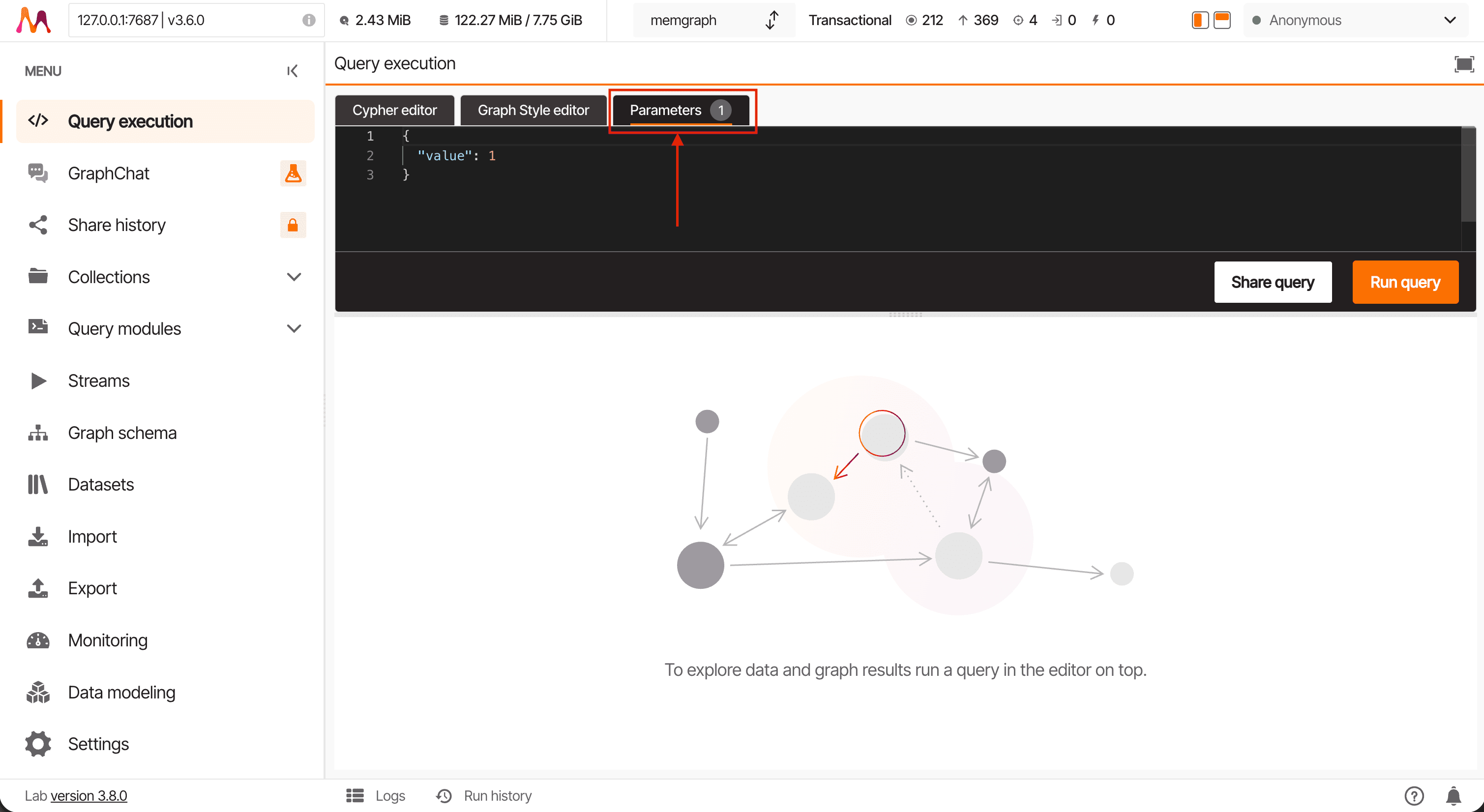 Memgraph Lab supports the use of parameters within queries to enhance efficiency. By defining parameters, you can write queries that accept variable inputs without altering the query structure. For example: