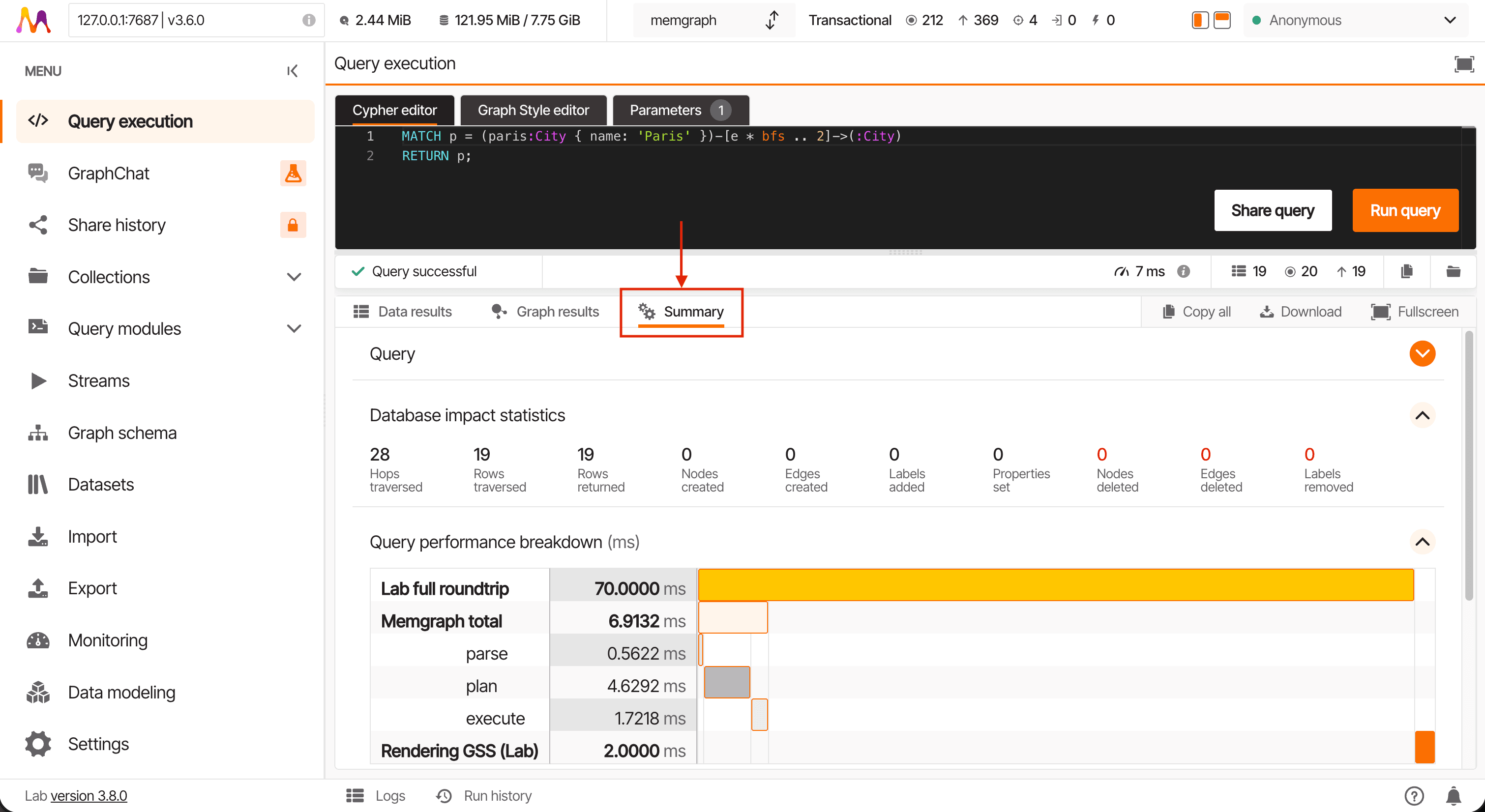 After executing a query in Memgraph Lab, the query summary provides essential metadata and insights into the execution process. This summary helps users evaluate the performance, efficiency, and impact of their queries.