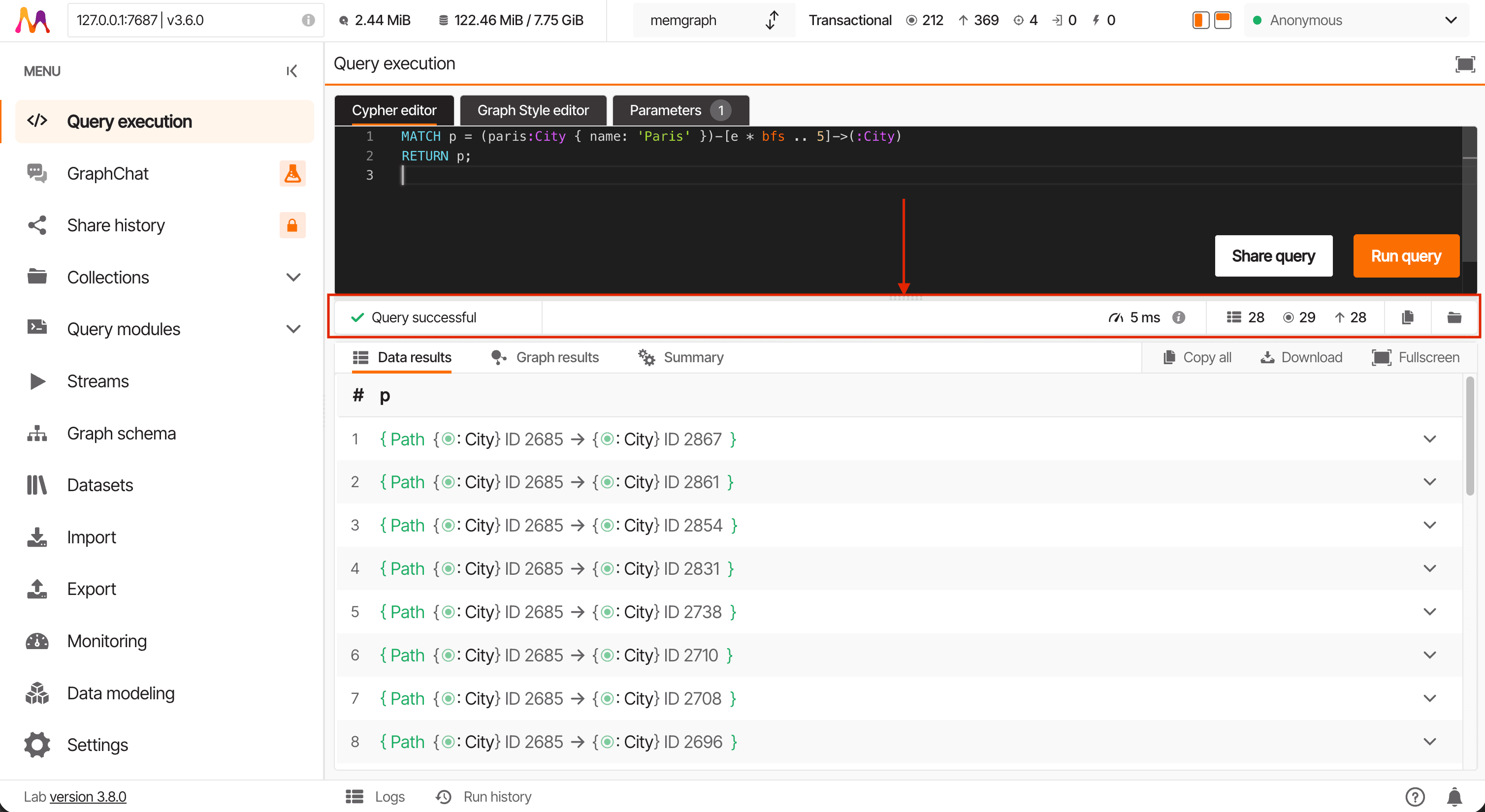 - Query execution status - When the query has executed or failed, below the Cypher editor, you can see a Query successful message or an error.