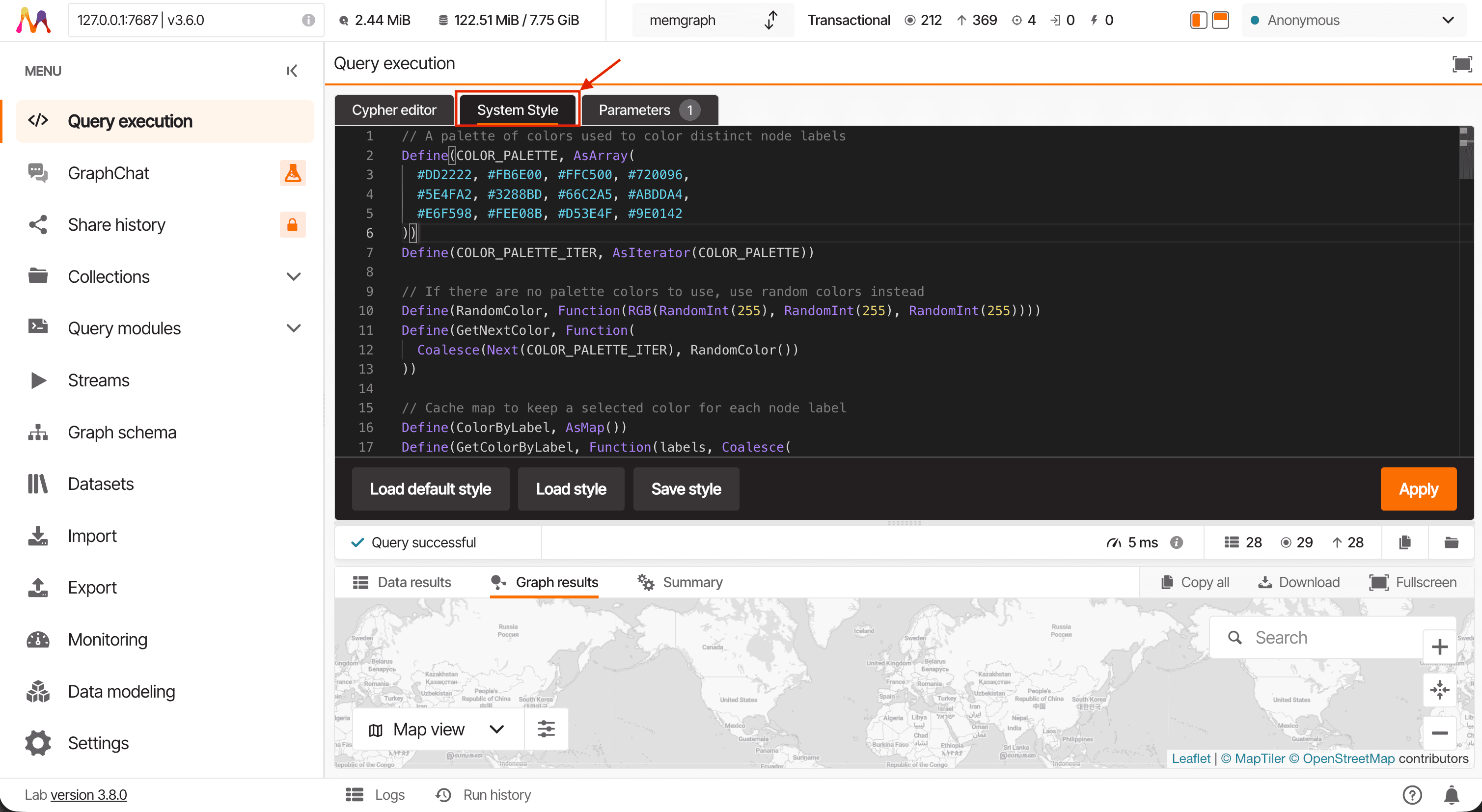 When saving a style, the graph results of an executed query will be used as a preview picture of the style. Custom styles can be defined as a default style applied to all following query runs.